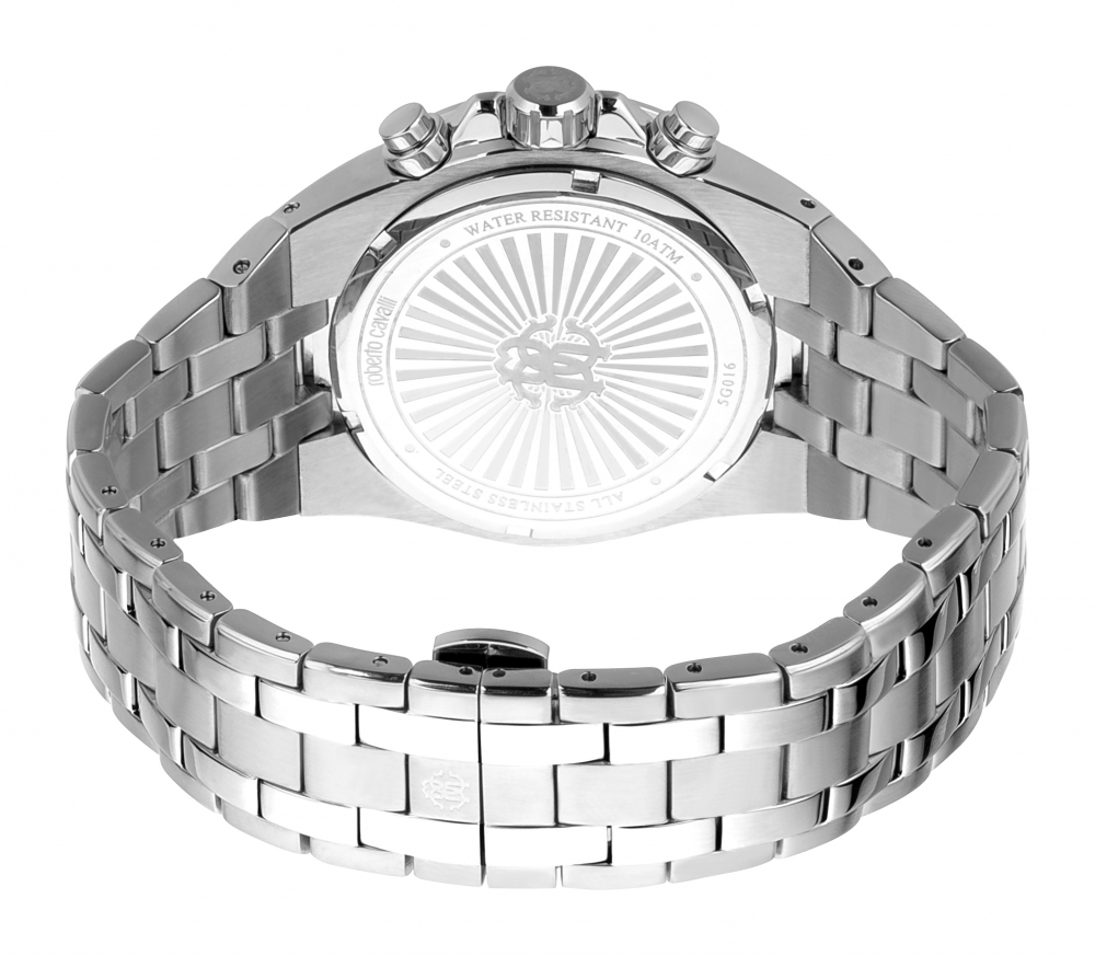 Add some elegant flair with this Black dial watch by Roberto Cavalli crafted in stainless steel featuring Silver stainless steel strap, analog display & quartz movement. Water resistant : 100 meters. Dimensions: Case size: 43 mm.